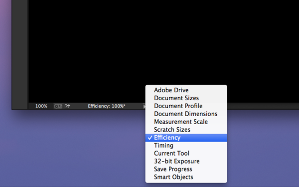 在PSCC工作区的左下方有一个指示,可现实当前的文件信息。默认状态下,它显示的是“文件大小”,类似“文档:12.5M/384.5M”这样的指示。这时,点击好似播放按钮的符号“▶”,就可以按照你的喜好进行自定义设置显示内容,其中就包括“效率”这一项。