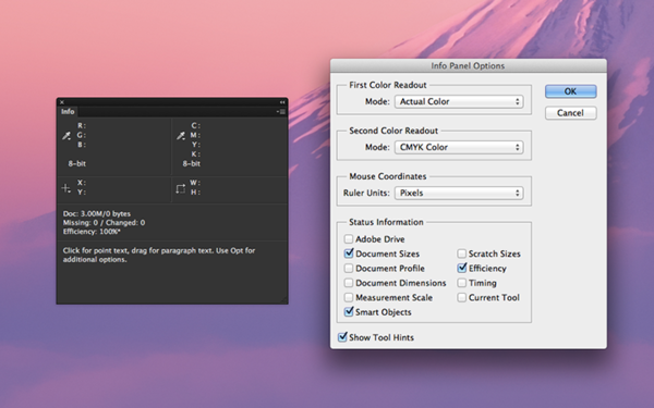 调出“效率”这一显示内容后,一般显示的会是“效率:100%”。而当该数值低于100%的时候,则意味着你并未分配足够的内存给PS,这时候PS会调用磁盘空间来支持运转,PS的图像处理运行自然会慢下来。如果你看到该数值已经低过90%了,那么你就该分配更多的内存给PS。当然,这里我们稍后再做详细解说。