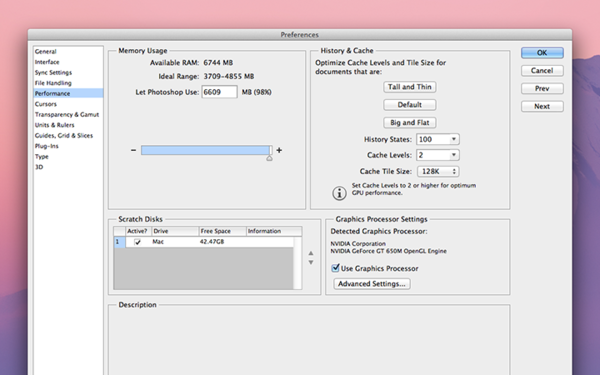 以笔者为例,笔者现在使用的是一个15寸Retina屏幕MacBook Pro,内置2.4GHz Intel Core i7处理器,8G内存和Nvidia GeForce GT 650M显卡。这里,笔者就介绍一下根据笔者自己的硬件情况,如何调整PS偏好设置。各位网友的话,自然也是要根据自己的硬件情况,进行PS偏好设置调整。